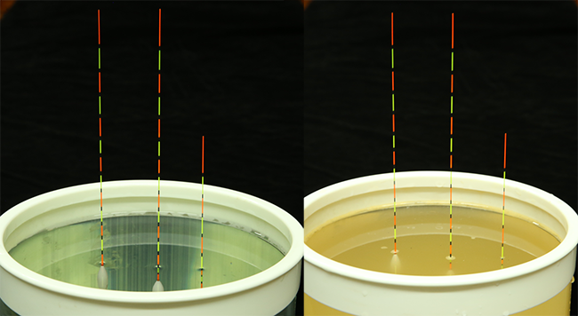 結(jié)論:不同的水體,雖然成分有變化,但對(duì)浮漂的影響非常細(xì)微,漂目上沒有變化,(在現(xiàn)實(shí)中,能夠讓魚類存活的水域,其水質(zhì)含有泥漿、鹽分等其他成分的濃度不可能非常高),所以,“漲目”跟水質(zhì)沒有關(guān)系。